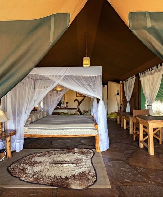 Cada tienda, construida con materiales naturales y camas talladas en troncos de arbustos locales, ha sido diseñada para fusionar el confort moderno con el espíritu tradicional del África salvaje. Tras un día de safari, entre caminos polvorientos y encuentros inolvidables con la fauna, nada como una ducha refrescante en tu baño privado, un chapuzón en la piscina o un merecido descanso en el spa.