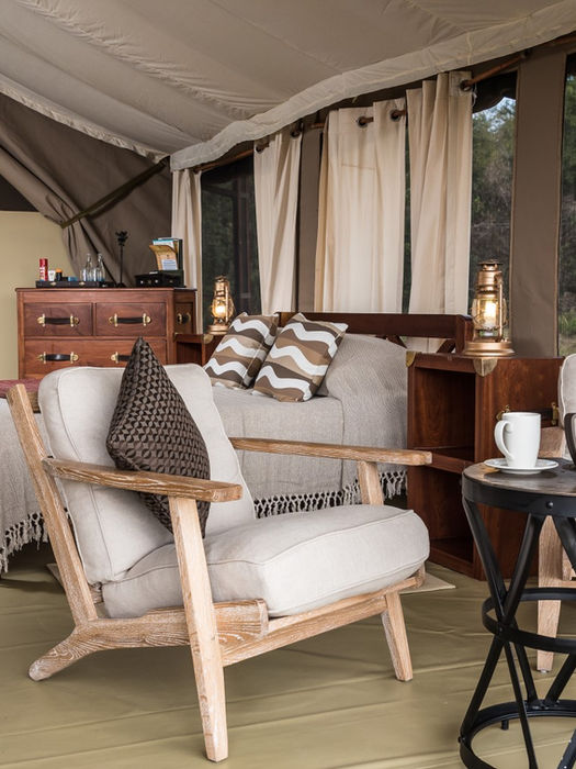 Las tiendas, elegantemente decoradas y construidas sobre plataformas de madera, combinan comodidad y estilo. Cada una ofrece camas de plaza y media, vestidor, escritorio, una acogedora sala de estar, baño privado con lavabo de latón, ducha caliente y una terraza perfecta para perderte en el paisaje africano.